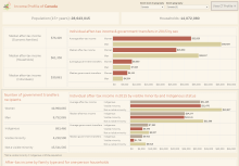 The 2021 Census Profile: Income Dashboard displays data from Statistics Canada's 2021 Census Profile on the topics of of individual, household and family income, as well as low income and income inequality. This dashboard allows users to view 2021 Census indicators in an interactive map and generate detailed profiles of individual geographies. |
